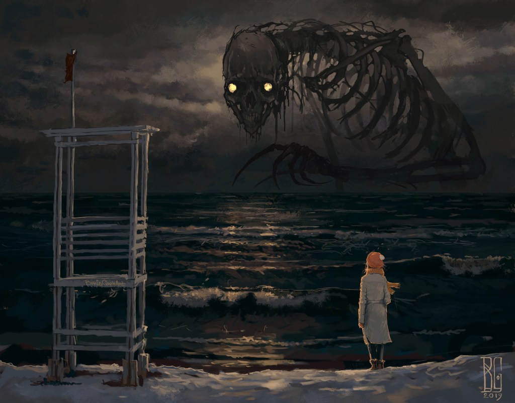 This creature was massive, yet its voice was dry and of a higher pitch than I had expected. It spoke in long, heavy breaths between pauses, and the wind from the sea made a mournful creaking sound as it weaved between the creature’s bones. Its pale, yellow eyes stared at me; I saw a strange curiosity in them; I supposed it hadn’t seen a child here before.