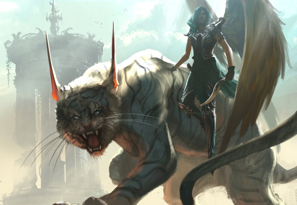 The Gatekeeper folded her wings neatly as she dismounted from her beast. The large animal kept staring at me, its ears twitching as if it were eager to just swallow me whole.